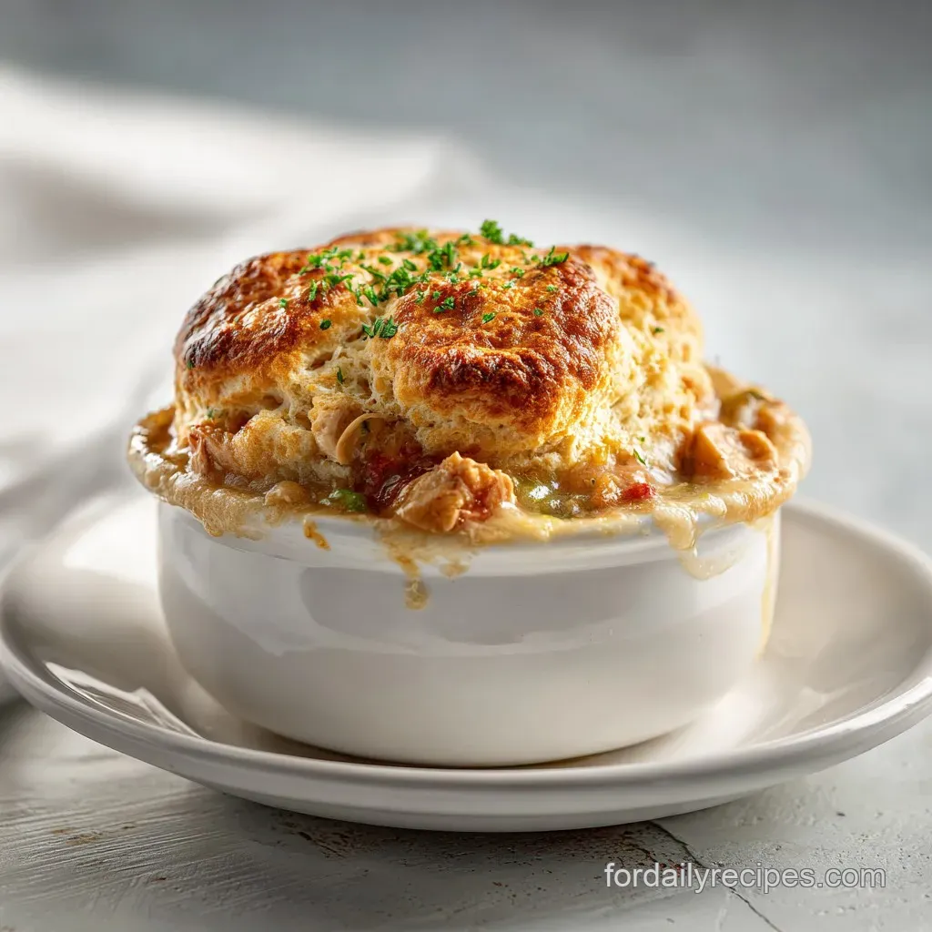 It is a savory comfort dish featuring layered ingredients. It combines shredded chicken, vegetables, and a creamy gravy base, all topped with a biscuit style crust that bakes into a golden, bubbly finish.